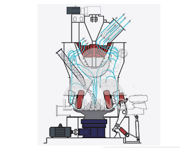 電動(dòng)機(jī)通過減速裝置帶動(dòng)磨盤轉(zhuǎn)動(dòng),同時(shí)熱風(fēng)從進(jìn)風(fēng)口進(jìn)入磨機(jī)內(nèi),物料從進(jìn)料口落在磨盤中央,磨輥在施壓裝置產(chǎn)生的粉磨力作用下碾壓置于磨盤上的物料。磨輥不繞地面垂直線公轉(zhuǎn),但在物料阻力作用下繞自身的軸自轉(zhuǎn),由于離心力的作用,物料向磨盤邊緣移動(dòng),經(jīng)過磨盤上的環(huán)形槽時(shí),受到磨輥的碾壓而粉碎,并繼續(xù)向磨盤邊緣移動(dòng),在磨盤邊緣的環(huán)形區(qū)域被自下向上的氣流帶至位于上部的分級(jí)裝置,經(jīng)過分離器時(shí),在導(dǎo)向葉片和轉(zhuǎn)子的作用下,粗料下落到磨盤上重磨,細(xì)粉隨氣流一起出磨機(jī),在系統(tǒng)收塵裝置中收集,即為成品。物料在與氣體接觸過程中被烘干,達(dá)到所要求的產(chǎn)品水分。通過調(diào)節(jié)葉片的角度或分離器轉(zhuǎn)子轉(zhuǎn)速,便可得到不同細(xì)度的產(chǎn)品。